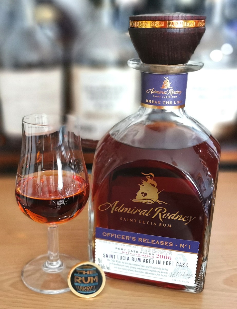 Nadrozměrná zátka s nápisem „Break The Line“ pochází z destilerie Saint Lucia Distillers na Svaté Lucii a je součástí řady Admiral Rodney, označované jako „Super Premium“. Toto speciální vydání s omezeným počtem 4200 lahví nese název Officer’s Release a je první z série. Název je inspirován admirálem George B. Rodneyem, který jako brilantní námořní stratég proslul v bitvě u Svaté, kde „prolomil francouzskou linii“. Lahvuje se na 45% ABV a zraje 13 let v sudech po bourbonu a následně 9 měsíců v sudech po portském. Na nosu se objevují vlivy portského, jako je jahodový džem, černý rybíz, červené hrozny a jablka, doplněné tabákem a kořením. Je poměrně dřevitý a kořenitý s náznaky kakaa a kardamonu. Chuť je intenzivní a tmavá, s plnou čokoládou, jahodovým krémem, pomerančovou kůrou, zralým banánem, javorovým sirupem, sušenými švestkami, ostružinami a vlašskými ořechy. Dozvuky jsou středně dlouhé a pikantní s kakaovými hrudkami a trochou máty peprné. V porovnání s vlajkovou lodí destilerie Chairman’s Reserve 2005 Vintage je Admiral Rodney Officer’s Release No. 1 dražší, ale nabízí pestřejší chuťový profil a větší složitost. Skóre 82/100. Na zdraví!