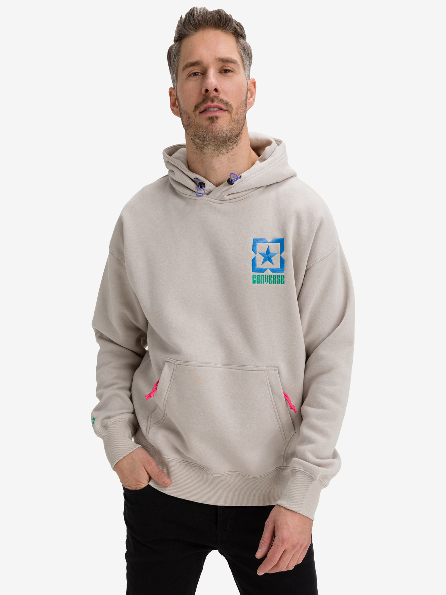 Materiál: 80% bavlna, 20% polyester Střih: classic fit Vzor: hladký s výšivkou Rukáv: dlouhý Kapuce: s kapucí Praní: 30°C Barva: šedo béžová