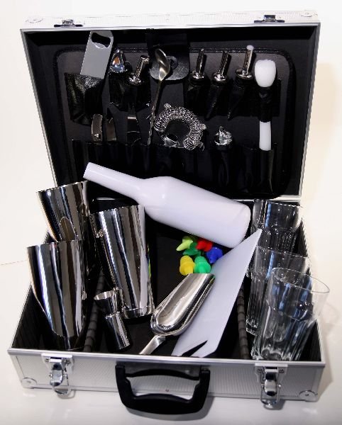 Barmanský kufr sestavený pro klasickou barmanskou práci i pro flair.
