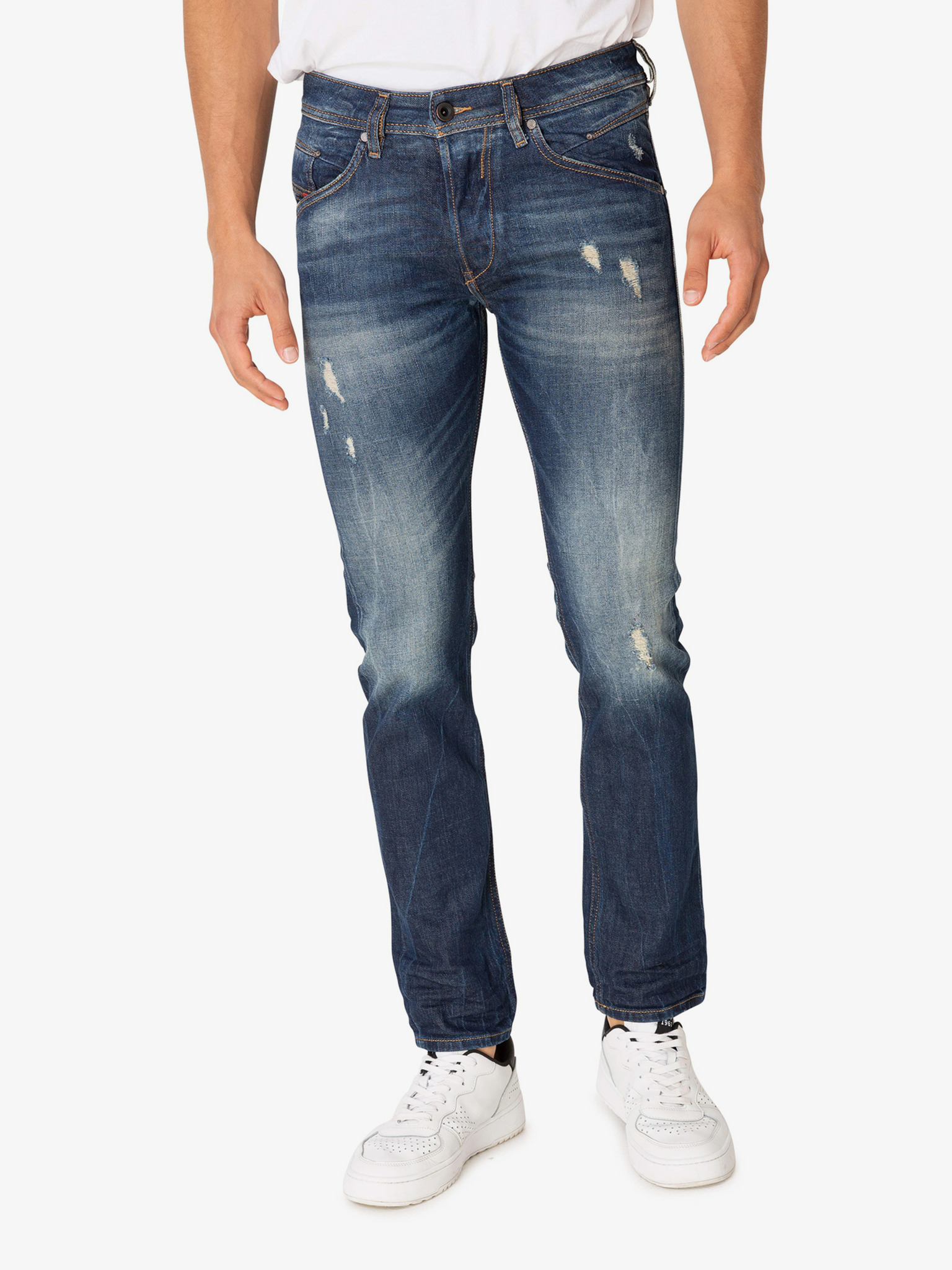 Model: Belther-R Barva: tmavě modrá Střih: slim fit Zapínání: knoflík, zip Délka: regular Něco navíc: vyšisovaný efekt Materiál: 99% bavlna, 1% elastan