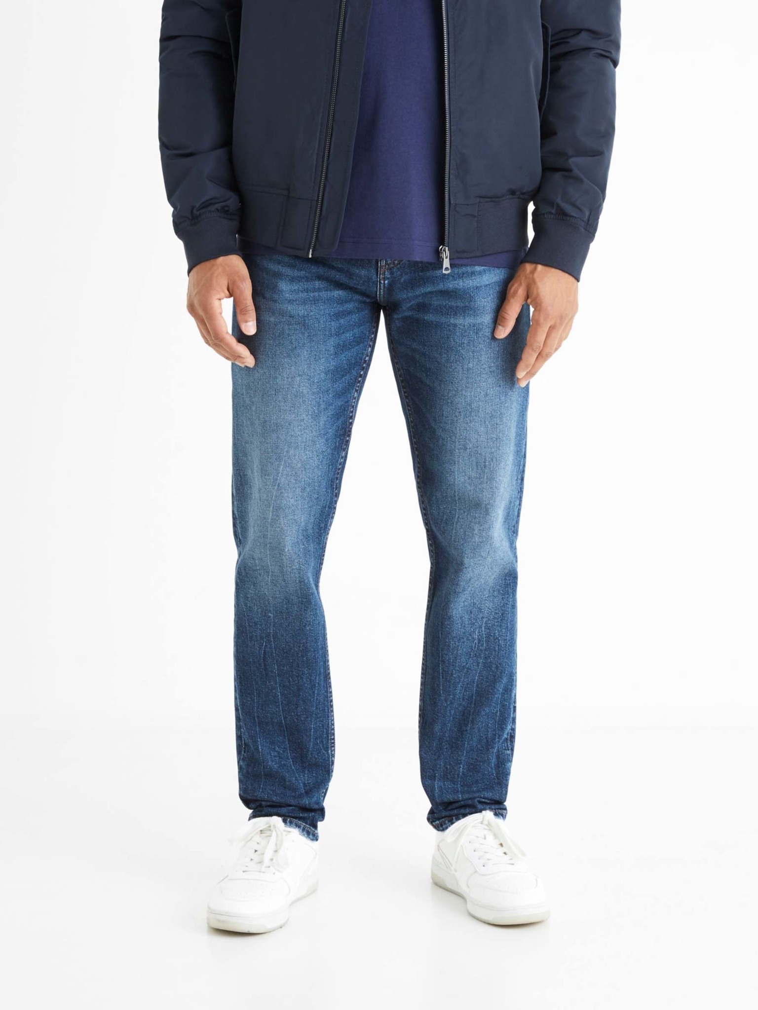 Model: C45 Barva: modrá Střih: straight fit Délka: regular Zapínání: zip, knoflík Něco navíc: vyšisovaný efekt Materiál: 99% bavlna, 1% elastan