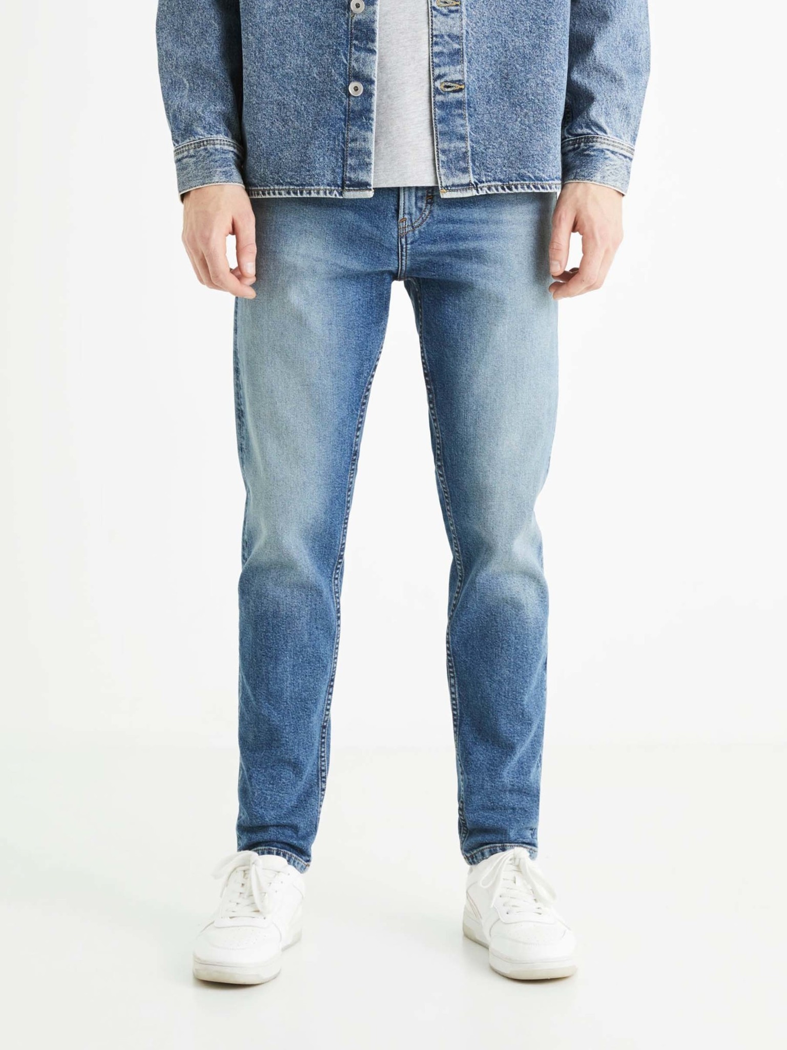 Model: C45 Barva: modrá Střih: skinny fit Délka: regular Zapínání: zip, knoflík Něco navíc: vyšisovaný efekt Materiál: 99% bavlna, 1% elastan