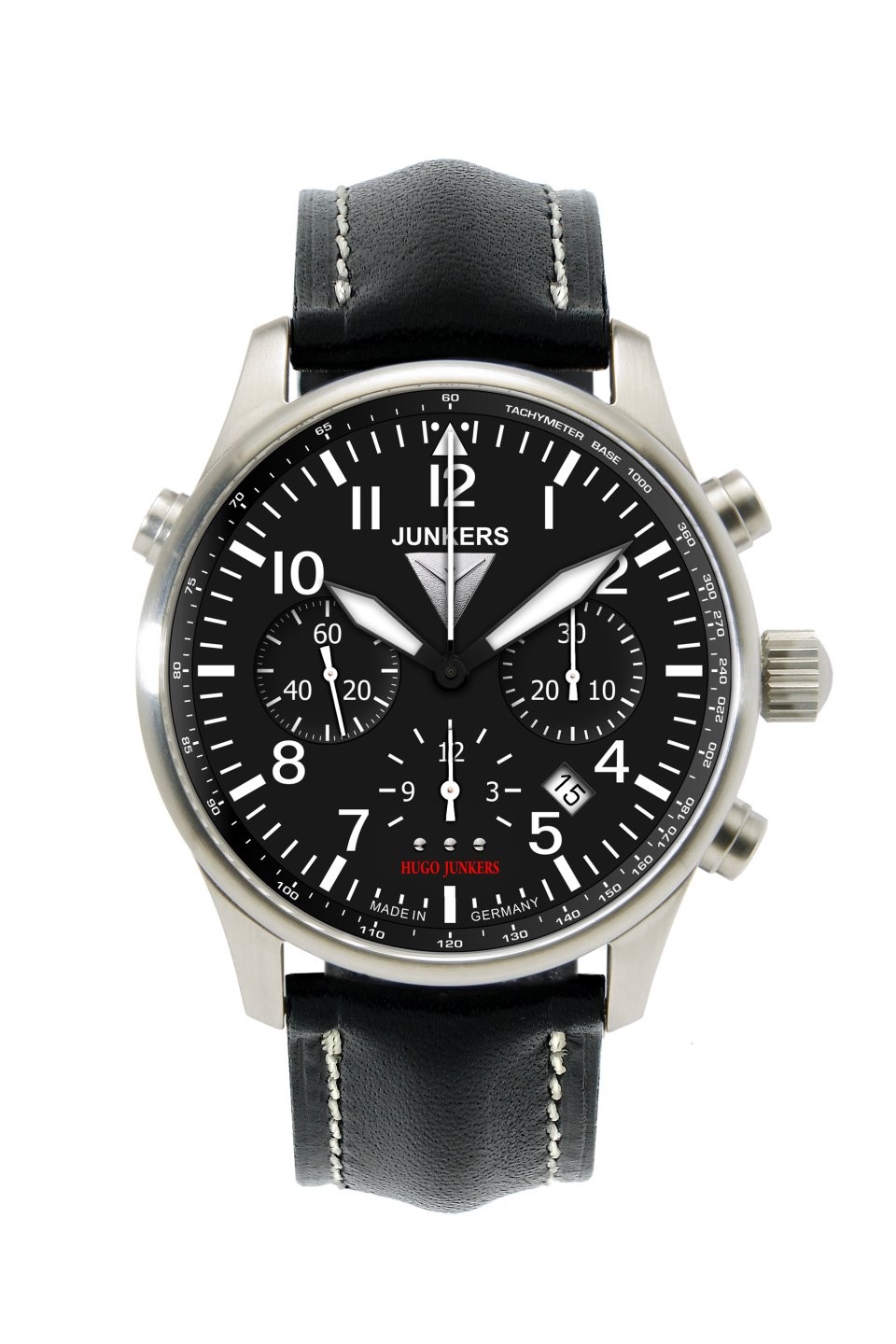 Hodinky Junkers 6626-2 z modelové řady Junkers Chronometer Glashuette Observatory se pyšní certifikátem chronometru observatoře v Glashütte, což řadí tento model k vrcholným kusům této německé značky a zaručuje mimořádně vysokou přesnost chodu… Na černém ciferníku, který nabízí klasický letecký design a osobitý vzhled, najdeme kromě stopek také ukazatel data a tachymetrickou stupnici. Sklíčko je safírové, majitel se tedy nemusí bát jakéhokoli poškrábání. Pouzdro z ušlechtilé oceli v sobě skrývá švýcarský mechanický strojek ETA Valjoux 7753, který disponuje automatickým nátahem a nabízí funkci rychlého posunutí data pomocí tlačítka na pozici 10. Jeho setrvačku, pracující na frekvenci 28 800 polokmitů za hodinu, lze pozorovat díky průhlednému dýnku. Voděodolnost hodinek Junkers 6626-2 je 50m, bez problému tedy zvládnou déšť, či sprchu. Vzhledem k prestižnímu certifikátu Chronometer Sternwarte Glashütte se můžete spolehnout na nejvyšší přesnost v různých polohách i při výkyvech teplot. Observatoř v Glashütte se řídí normou DIN 8319, což zaručuje maximální denní odchylku -4/+6 s za den, přičemž testování probíhá po dobu 15 dnů a při teplotách 8,23 a 38 °C. Největší rozdíl oproti známějšímu prestižnímu švýcarskému certifikátu COSC najdeme v tom, že testování observatoře v Glashütte probíhá s kompletními hodinkami (zatímco v případě COSC je testován pouze samotný strojek), je tedy dosaženo lepší simulace provozu v reálných podmínkách.