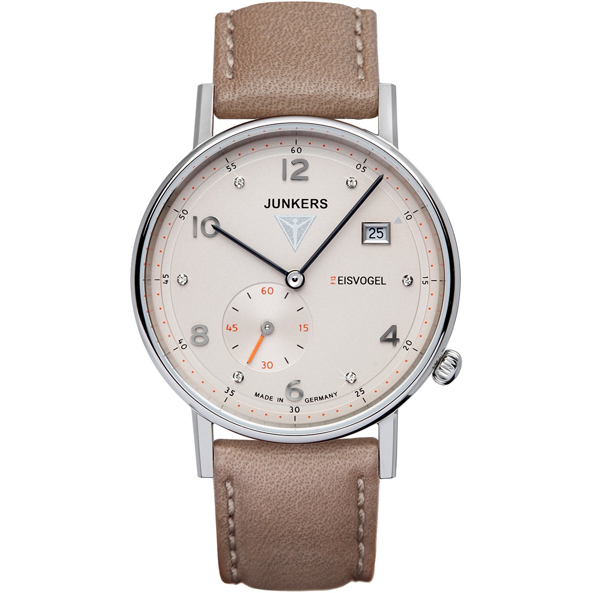 Hodinky Junkers 6731-4 z modelové řady Eisvogel F13 Lady nabízí přehledně zpracovaný ciferník, díky kterému budou skvělý doplňkem do společnosti, či při každodenním nošení. Osazeny jsou švýcarským bateriovým strojkem Ronda 6004.D. Přehledný ciferník, doplněný o minimalistické ručičky, nabízí na 2. hodině ukazatel data a je zdoben kamínky Swarovski. Vteřinová ručička obíhá ve vlastním subcefníku u 7. pozice. Voděodolnost je 50m, minerální sklíčko je vsazeno do ocelového pouzdra. Hodinky Junkers 6731-4 jsou dodávány s elegantním koženým řemínkem, který vhodně ladí s designem ciferníku. Díky svému průměru pouzdra 36mm potěší všechna dámská zápěstí. Celá modelová řada odkazuje na léto roku 1923, kdy letoun Junkers F13 EISVOGEL uskutečnil první přelet ze Špicberků směrem k Severnímu pólu. Řadu Eisvogel Junkers věnoval právě této dobrodružné cestě do srdce polárního ledovcového regionu. Hodinky v této sérii ztělesňují krásu řemeslného zpracování a jeho propojení s technickými znalostmi a sofistikovaným designem. Recenze a testy: Hodinky byly vybrány jako "Hodinky měsíce února 2018"