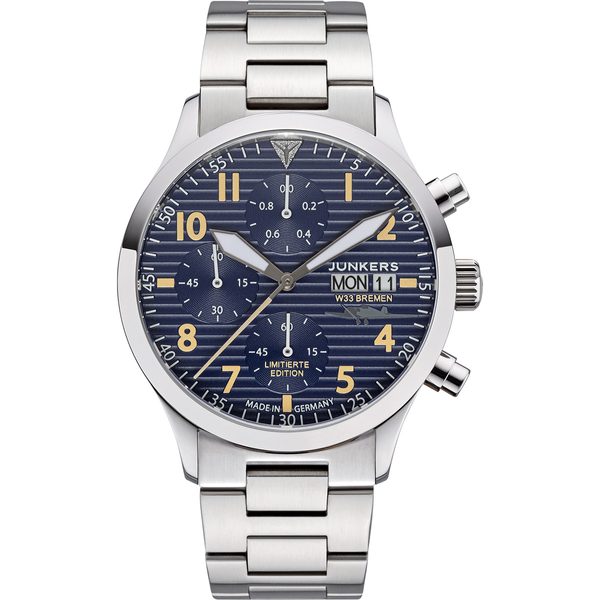 Hodinky Junkers Sondereditionen W33 Limitierte Sonderedition 9.14.02.01.M z modelové řady Sondereditionen jsou hodinky v atraktivním leteckém designu. Strukturovaný číselník odkazuje na vlnitý plech, typický pro letadlo Junkers Ju-52. Tyto hodinky výborně poslouží nejen v oblacích, ale i při běžném, každodenním nošení. Tento model byl vyroben v limitované edici 1926 kusů pro celý svět. Tento počet odkazuje na rok 1926, kdy vzlétl ke svému prvnímu letu jako hydroplán na Labi u Dessau jednomotorový nákladní…