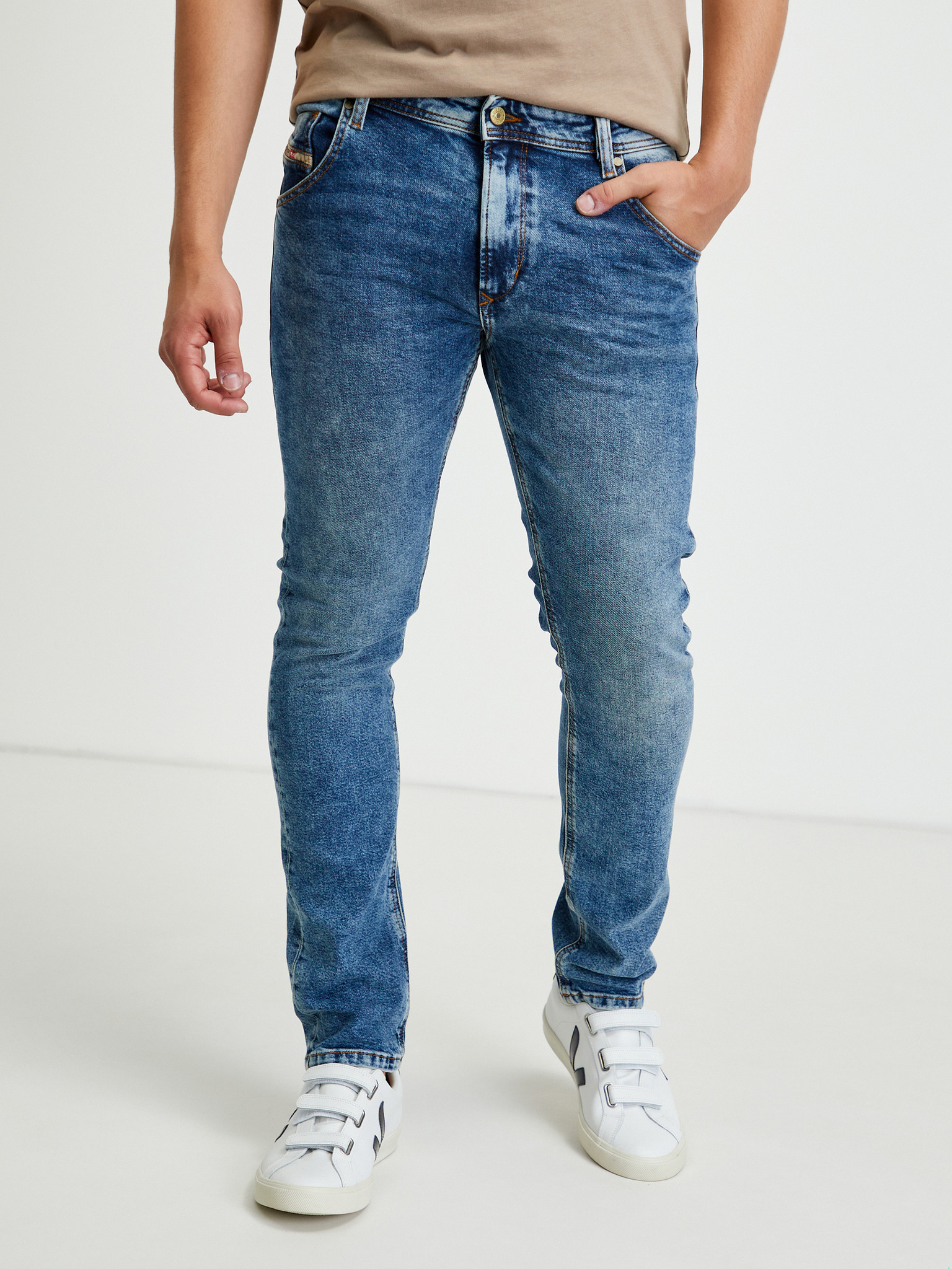 Model: Krayver Barva: tmavě modrá Střih: slim fit Délka: regular Zapínání: knoflík, zip Materiál: 99% bavlna, 1% elastan Model měří: 188 cm Model má na sobě velikost: L