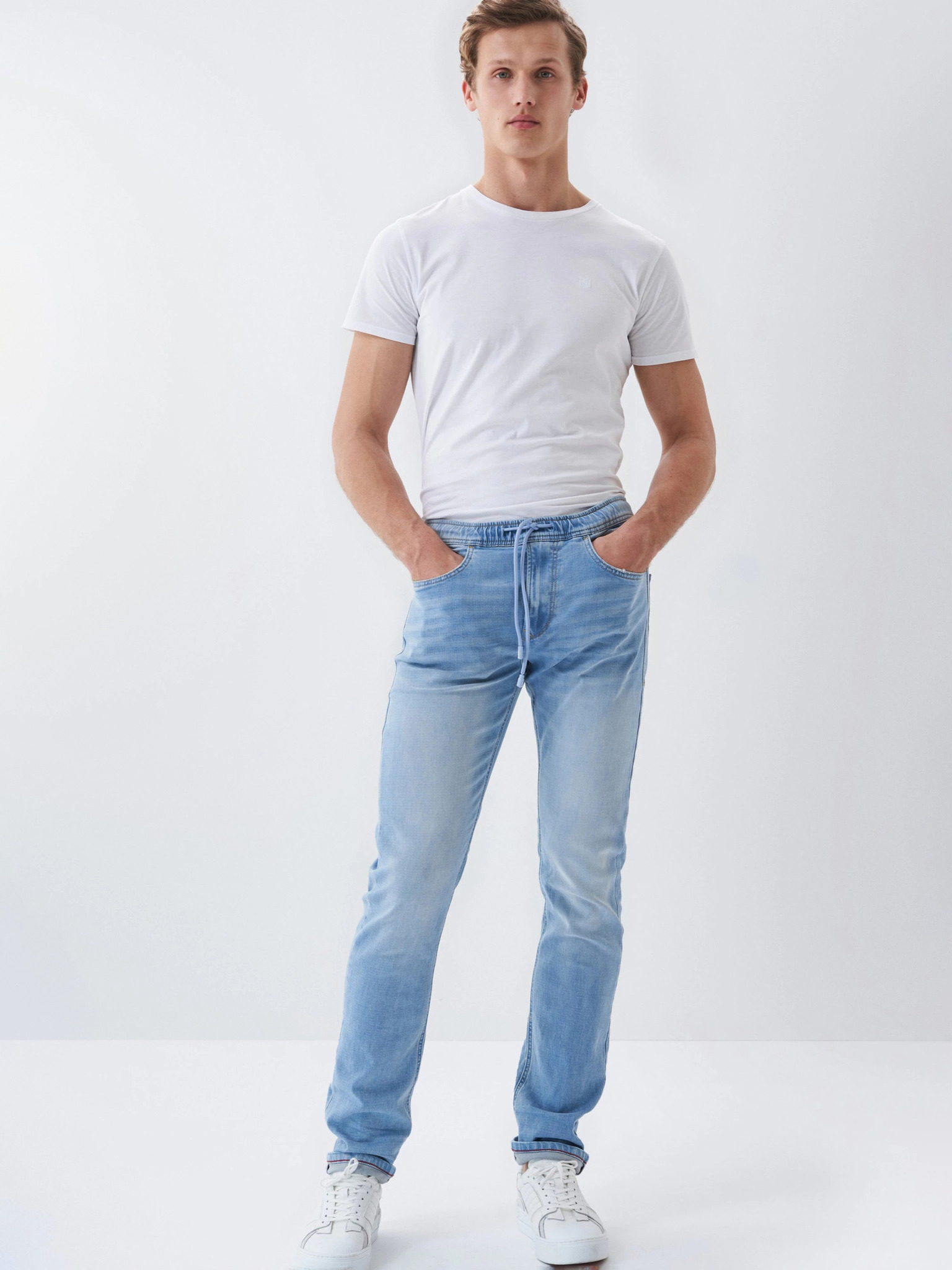Model: Regular Barva: světle modrá Střih: slim fit Délka: regular Zapínání: na gumu Něco navíc: možnost stažení v pase, vyšisovaný efekt Materiál: 93% bavlna, 6% polyester, 1% elastan