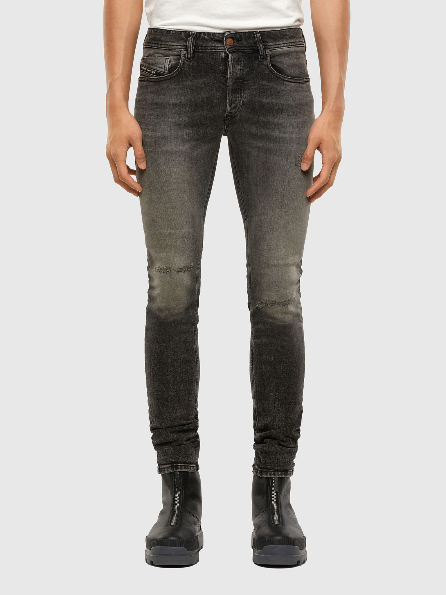 Model: Sleenker Barva: šedá Střih: slim fit Délka: regular Zapínání: knoflík, zip Něco navíc: vyšisovaný efekt, potrhaný efekt Materiál: 99% bavlna, 1% elastan