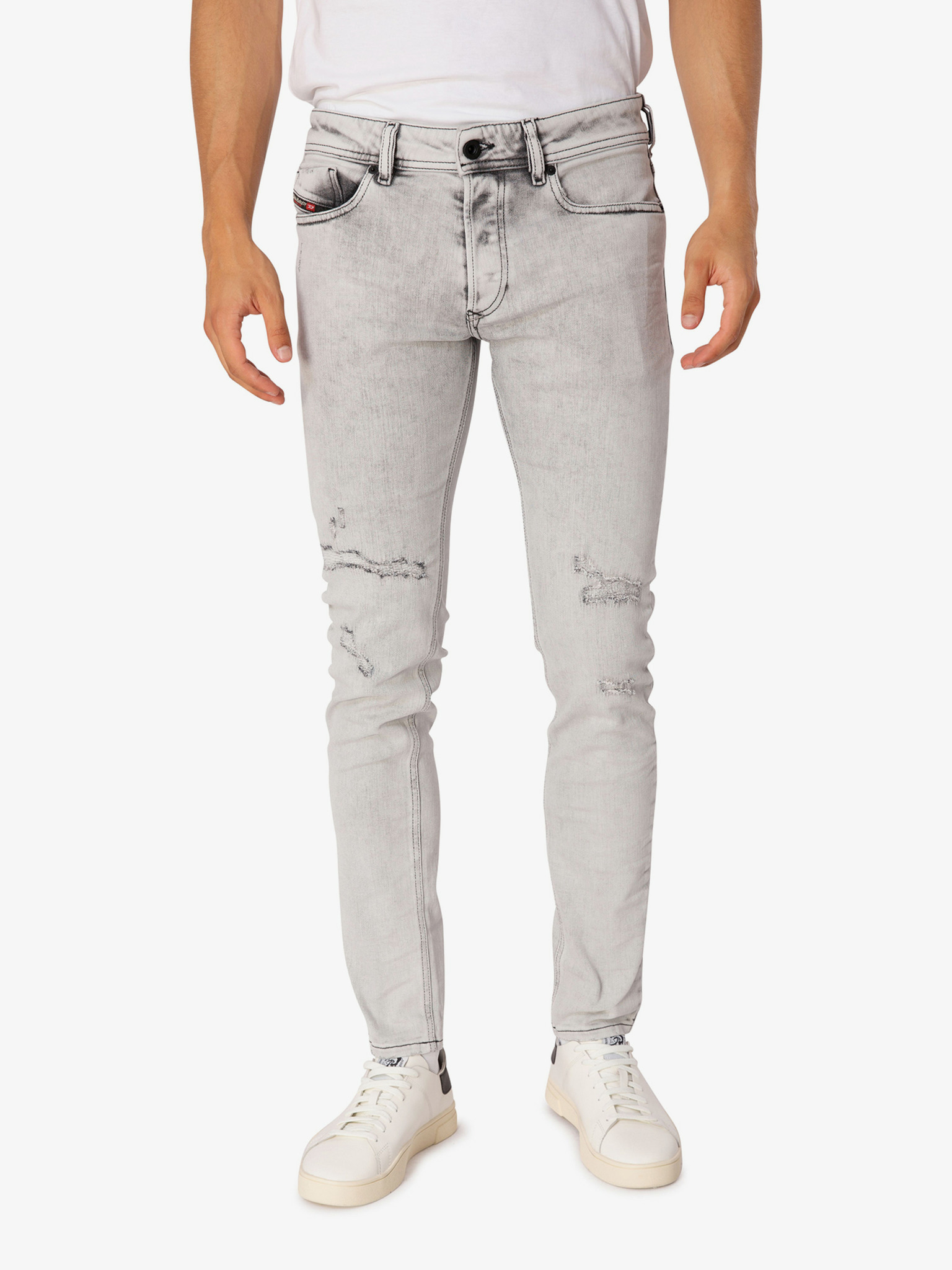Model: Sleenker-X Barva: světle šedá Zapínání: knoflík, zip Něco navíc: vyšisovaný efekt, potrhaný efekt Materiál: 95% bavlna, 3% polyester, 2% elastan