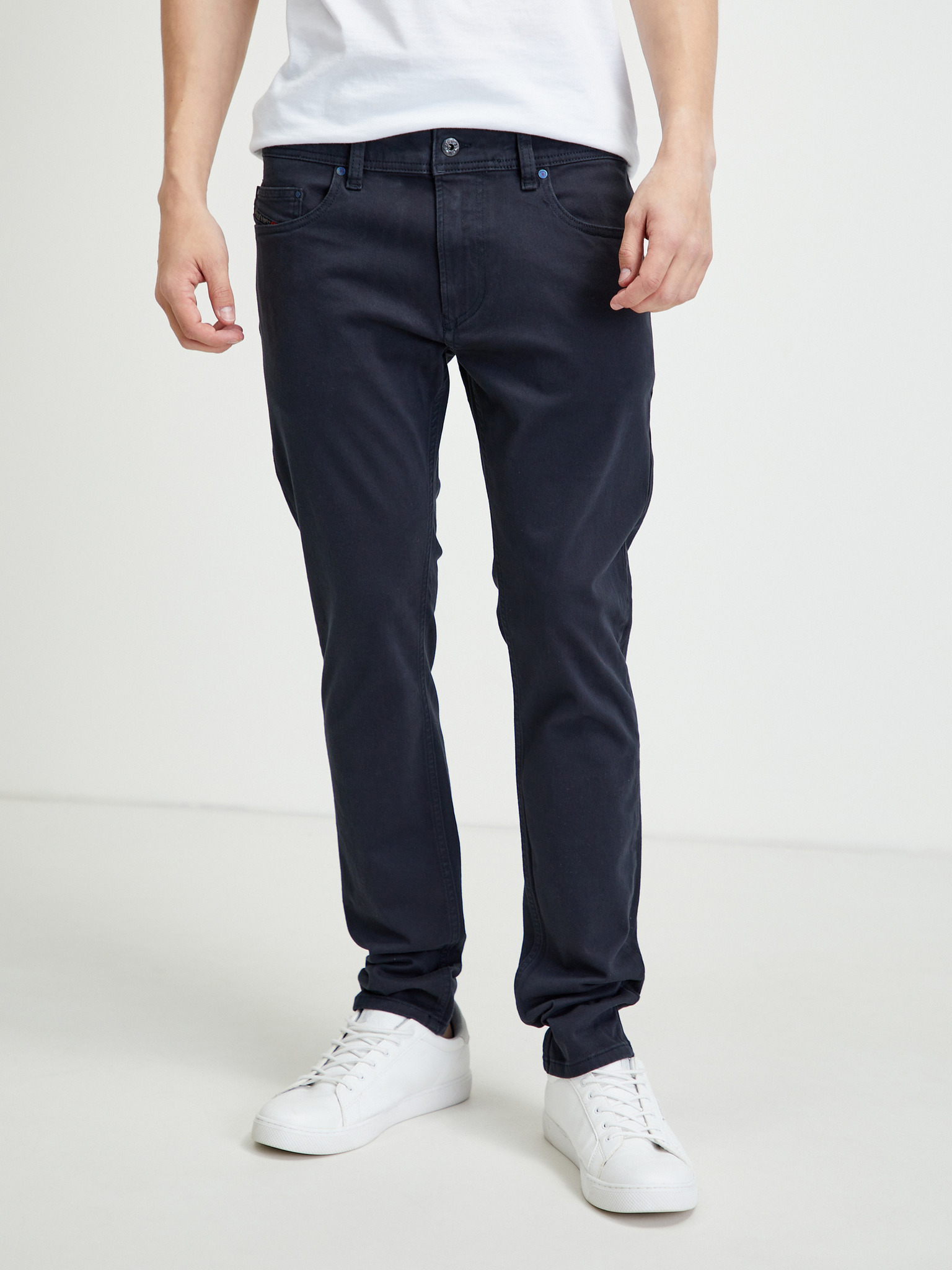 Model: Thavar Barva: černá Střih: slim fit Zapínání: knoflík, zip Délka: regular Materiál: 98% bavlna, 2% elastan Model má na sobě velikost: L Model měří: 185 cm