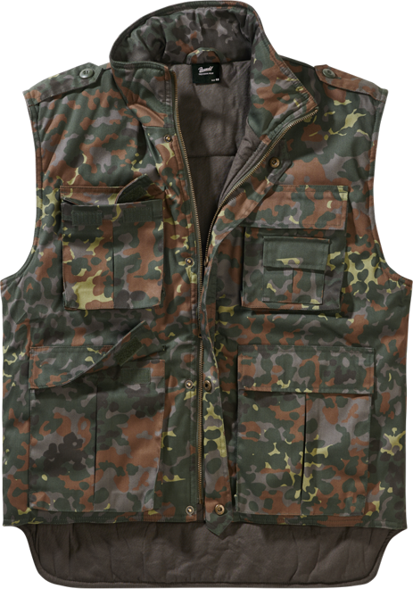 Pohodlná prošívaná vesta s mírně prodlouženými zády a velkým množstvím praktických kapes. Ideální pro chataře, chalupáře, rybáře a nimrody. vysoký límec – stojáček – pro ochranu krku zapínání vesty kovovým zipem krytým légou zapínanou na druky dvě velké průhmatové kapsy v pase kombinované se dvěma objemnými kapsami s chlopní na suchý zip dvě menší, ale stále objemné náprsní kapsy, zapínání chlopní se suchým zipem. Jedna z kapes členěna na dvě přihrádky a na přední straně má ještě malou kapsičku taktéž s chlopní na suchý zip vnitřní náprsní kapsa na zapínaná na suchý zip elegantní nárameníky s knoflíkem vesta má upravitelnou šířku v pase pomocí elegantních pásků se dvěma knoflíky mírně prodloužený zádový díl prošívaná podšívka Materiál: 80 % polyester, 20 % bavlna, podšívka 100 % bavlna, zateplení 100 % polyester Hmotnost: 750 g (velikost S) Výrobce: Brandit, Německo Kód výrobce: 4014