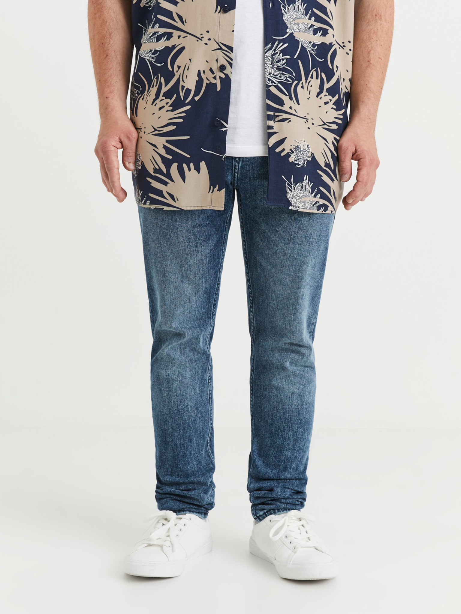 Model: Voslue25 Barva: modrá Střih: slim fit Zapínání: knoflík, zip Délka: regular Něco navíc: vyšisovaný efekt Materiál: bavlna, elastan