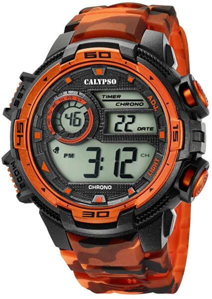 Hodinky z dílny značky Calypso si na první pohled oblíbí všichni pánové se zálibou ve výrazných doplňcích. Jejich pouzdro zaujme výraznou lunetou i tlačítky, které ještě umocňují masívní vzhled. Na zápěstí se hodinky připínají oranžovým pryžovým řemínkem s nadčasovým maskovacím vzorem. Digitální displej je díky dělení na několik částí přehledný, můžete si tak užívat funkce, které vám nabízí: