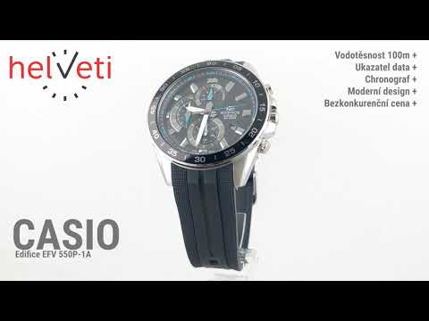 Casio Edifice EFV 550P-1A disponují ukazatelem data na pozici čtvrté hodiny a funkcí chronografu, jehož chod zobrazují tři přehledné subciferníky – čítač minut, vteřin a desetin vteřiny. Stopky lze ovládat postranními tlačítky – horní stopky spouští a zastavuje, spodní resetuje naměřené hodnoty. S hodinkami lze měřit až hodinové intervaly. Ocelové pouzdro hodinek je doplněno o černý pryžový řemínek. Přehledný černý číselník, zvýrazněný modrými prvky, je chráněn minerálním sklíčkem. Vodotěsnost tohoto modelu je 100 m – s hodinkami tedy můžete bez obav plavat. Díky průměru pouzdra 47 mm se řadí mezi velké hodinky.