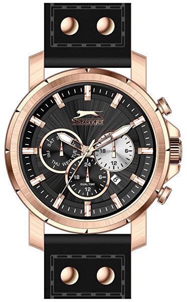 Tradiční britská značka Slazenger si vydobyla své postavení ve světě módy především díky nadčasovému sportovnímu oblečení a doplňkům v té nejvyšší kvalitě. Pokud jste i vy propadli kouskům zdobeným legendární kočkovitou šelmou, nesmí na vašem zápěstí chybět pánské hodinky Slazenger. Černý ciferník s jemnými odlesky zaujme třemi chronografy s funkcí dne v týdnu, 24 hodinového a duálního času, nechybí ani nezbytná datumovka. Oceníte i luminiscenční ručičky a indexy, díky kterým vždy perfektně uvidíte na aktuální čas. Na zápěstí se hodinky připínají koženým řemínkem v tradiční černé barvě. Růžově pozlacené pouzdro je vyrobené z tzv. „supermetalu“ – speciální slitiny, která nabízí stejnou odolnost jako ocel, jen za mnohem příznivější cenu. Dopřejte si doplněk, který vás nikdy nezklame.